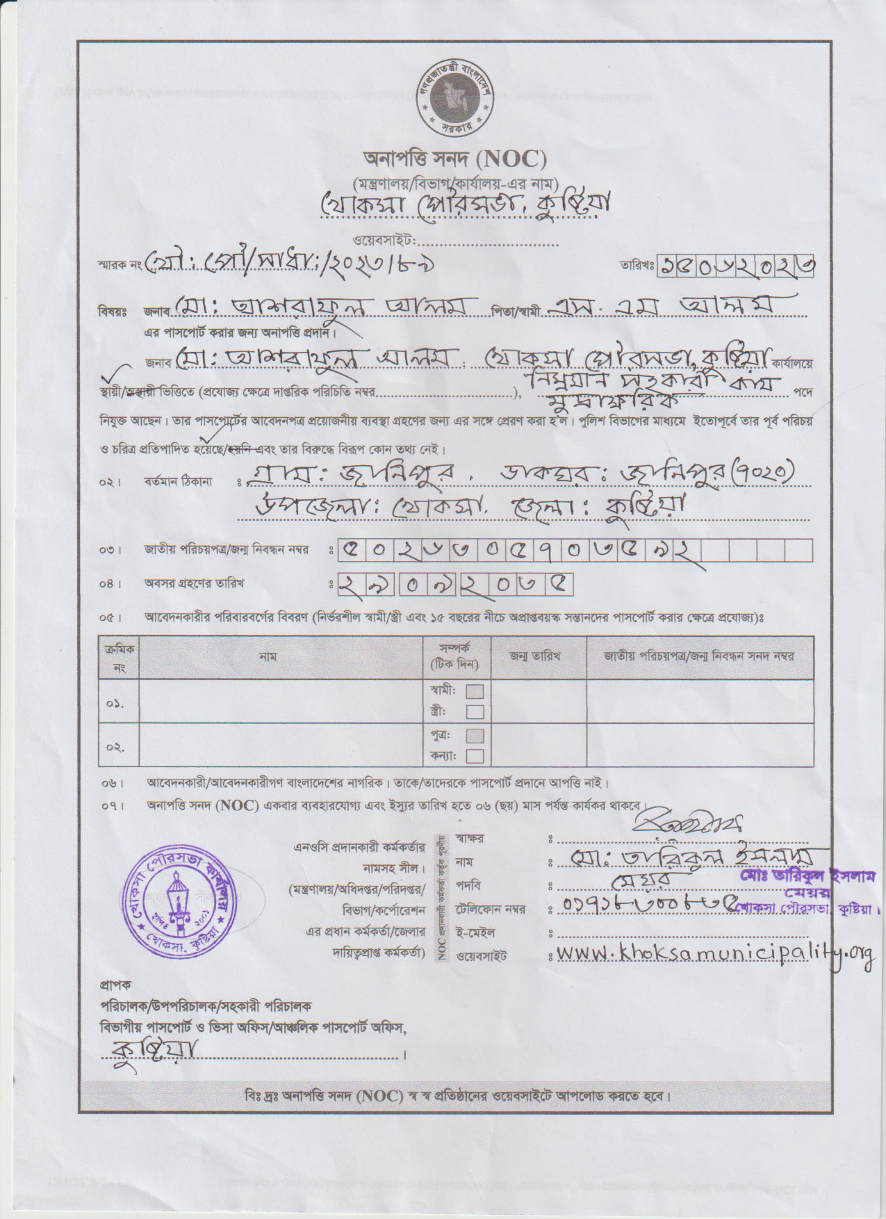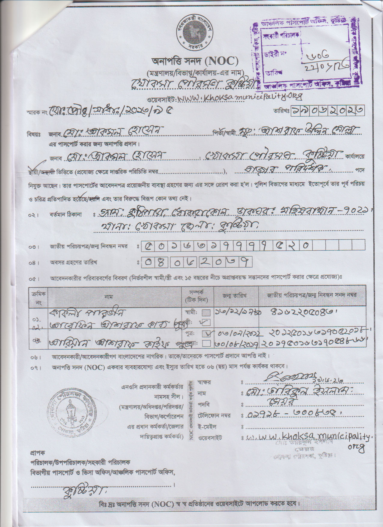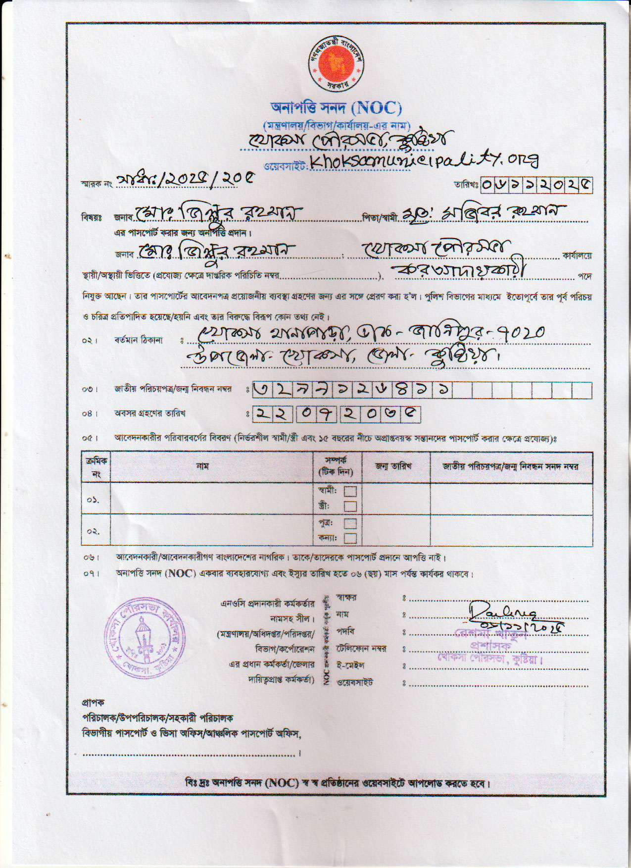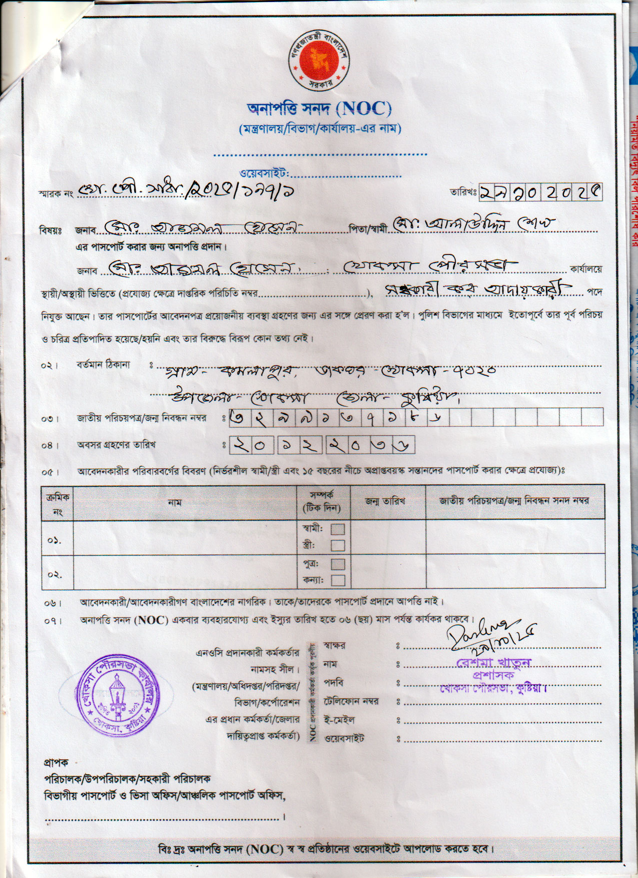 | ২. | জনাব মোঃ জিল্লুর রহমান, কর আদায়কারী (খোকসা পৌরসভা) এর অনাপত্তি সনদ (NOC) | ডাউনলোড |