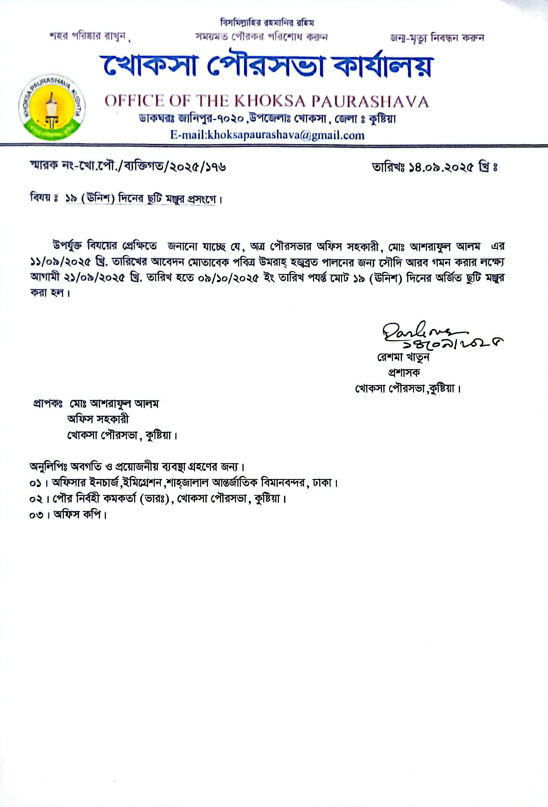 | ২. | জনাব মোঃ আশরাফুল আলম, অফিস সহকারী (খোকসা পৌরসভা) এর ছুটি মঞ্জুর প্রসংগে | ডাউনলোড |